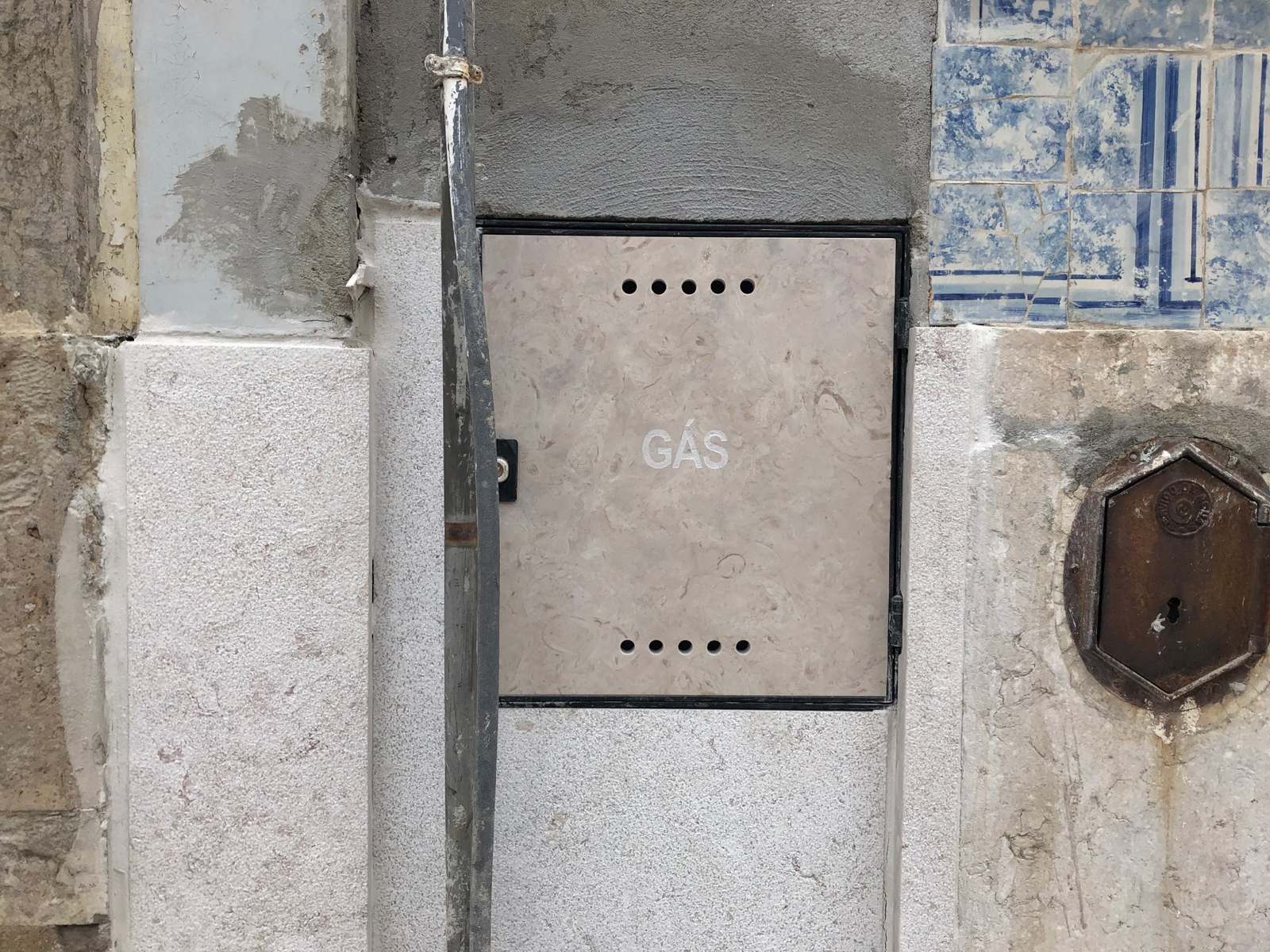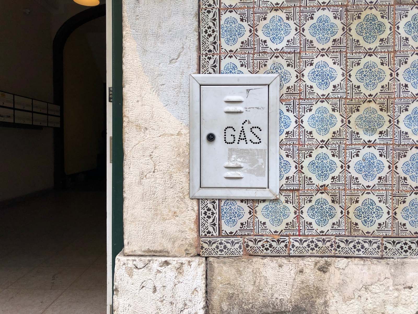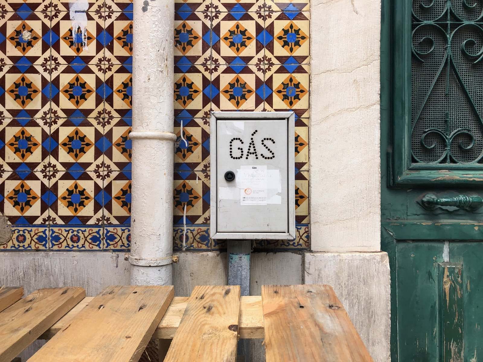 Lisbon features external access to gas with a blend of styling: traditional Portugese patterns on tile, followed by solid bright colors, then neutral tones. It was interested to find the set of doors with the punched stencil (round holes) forming the word GÁS.