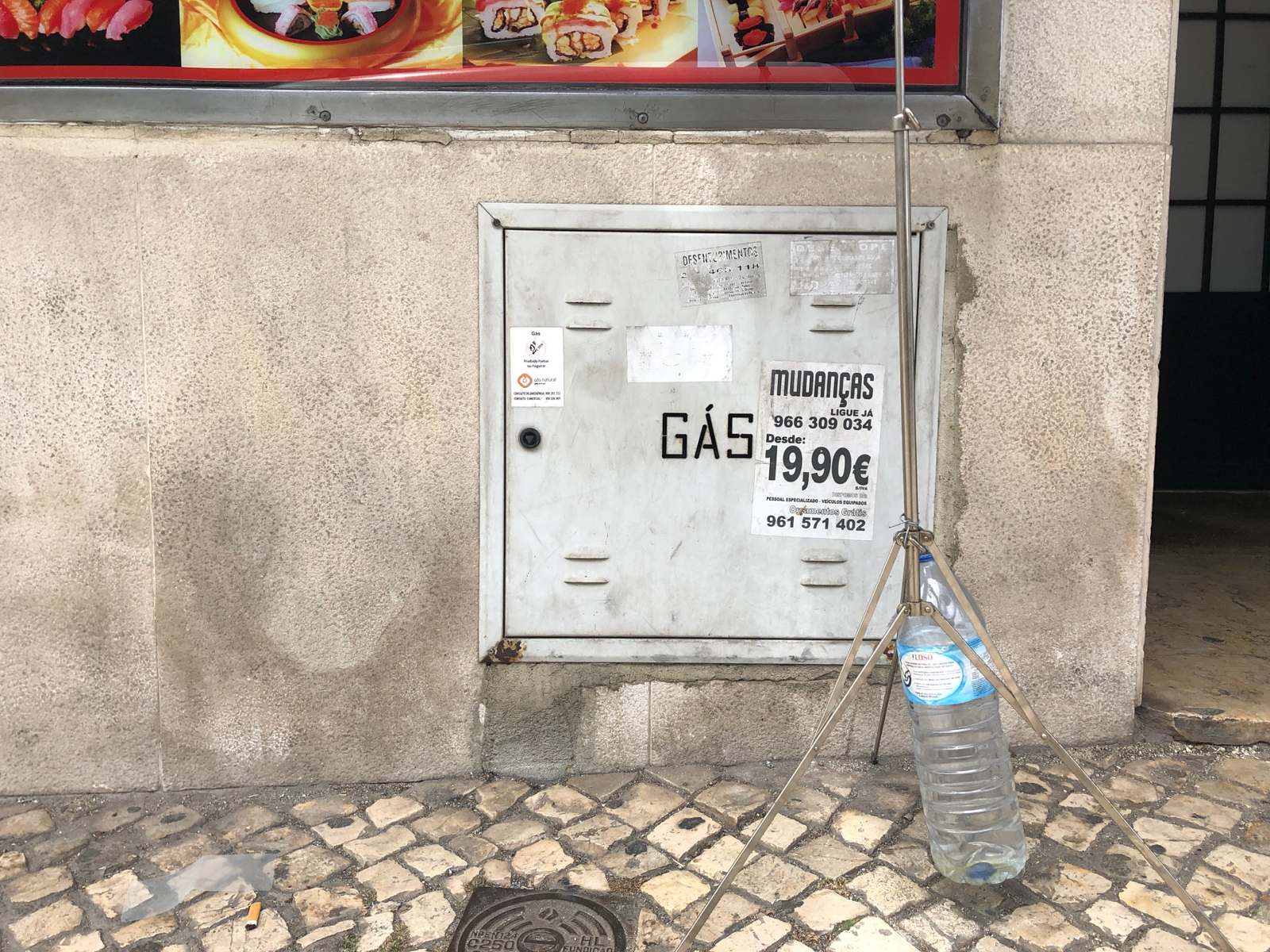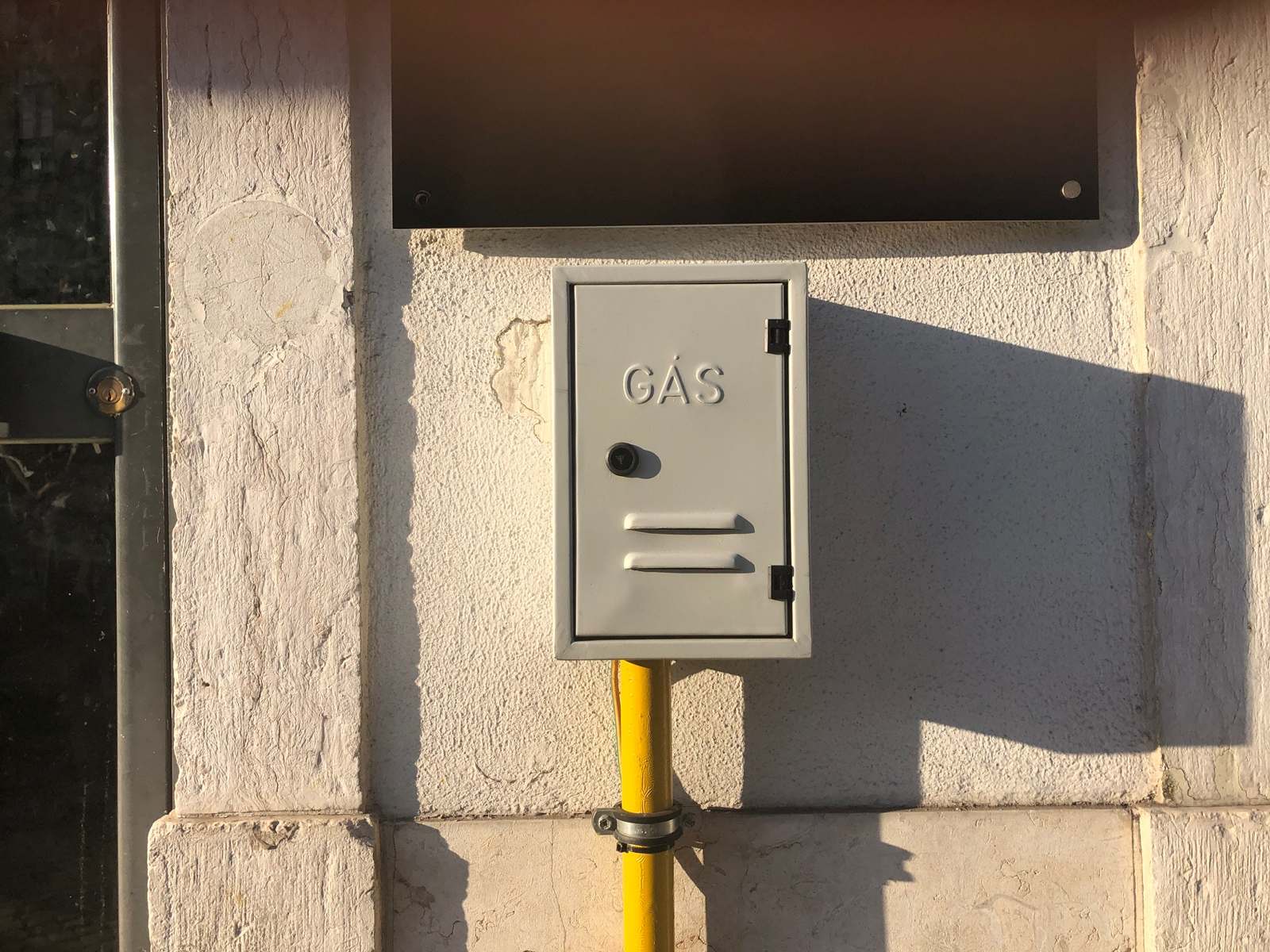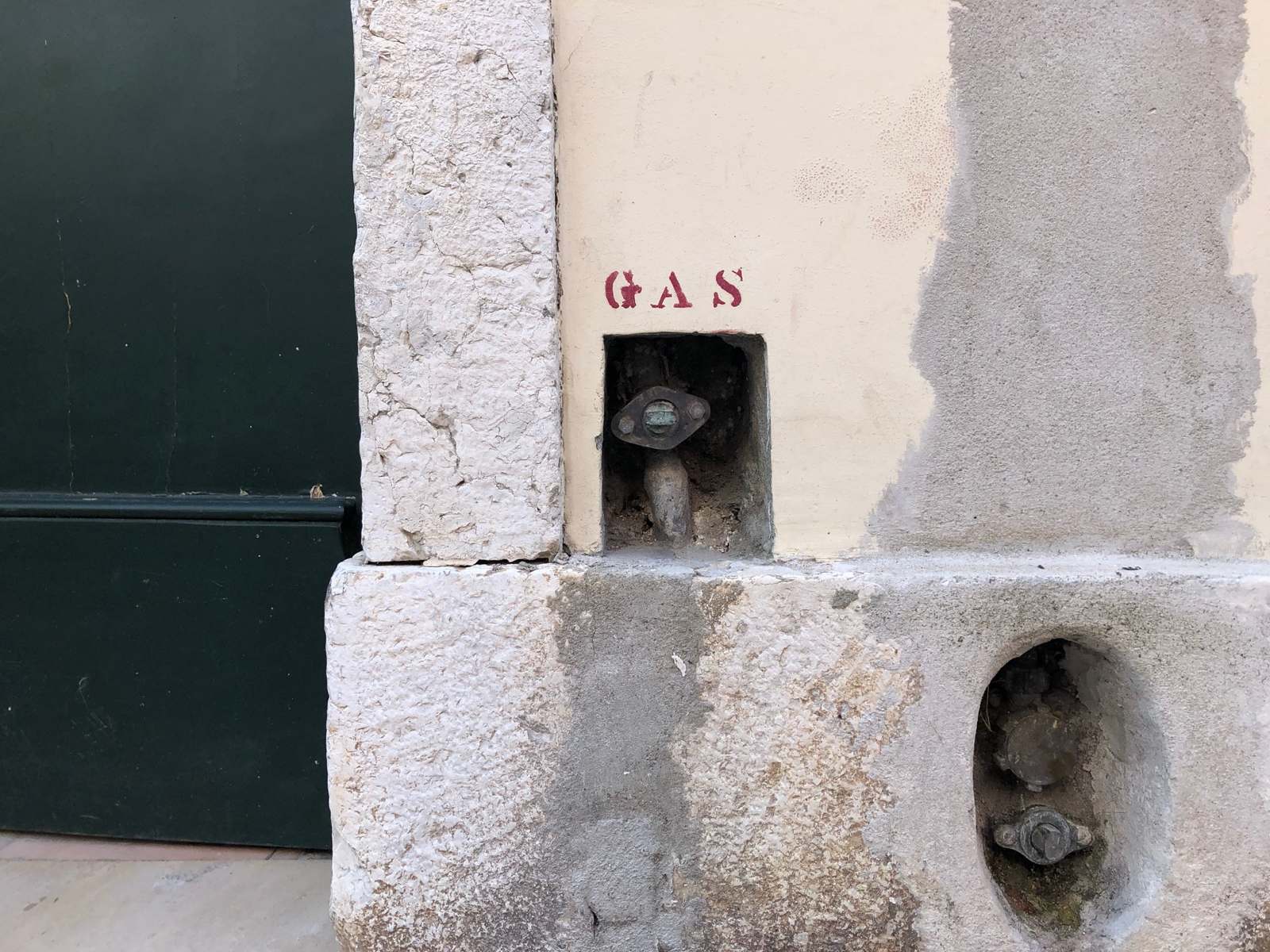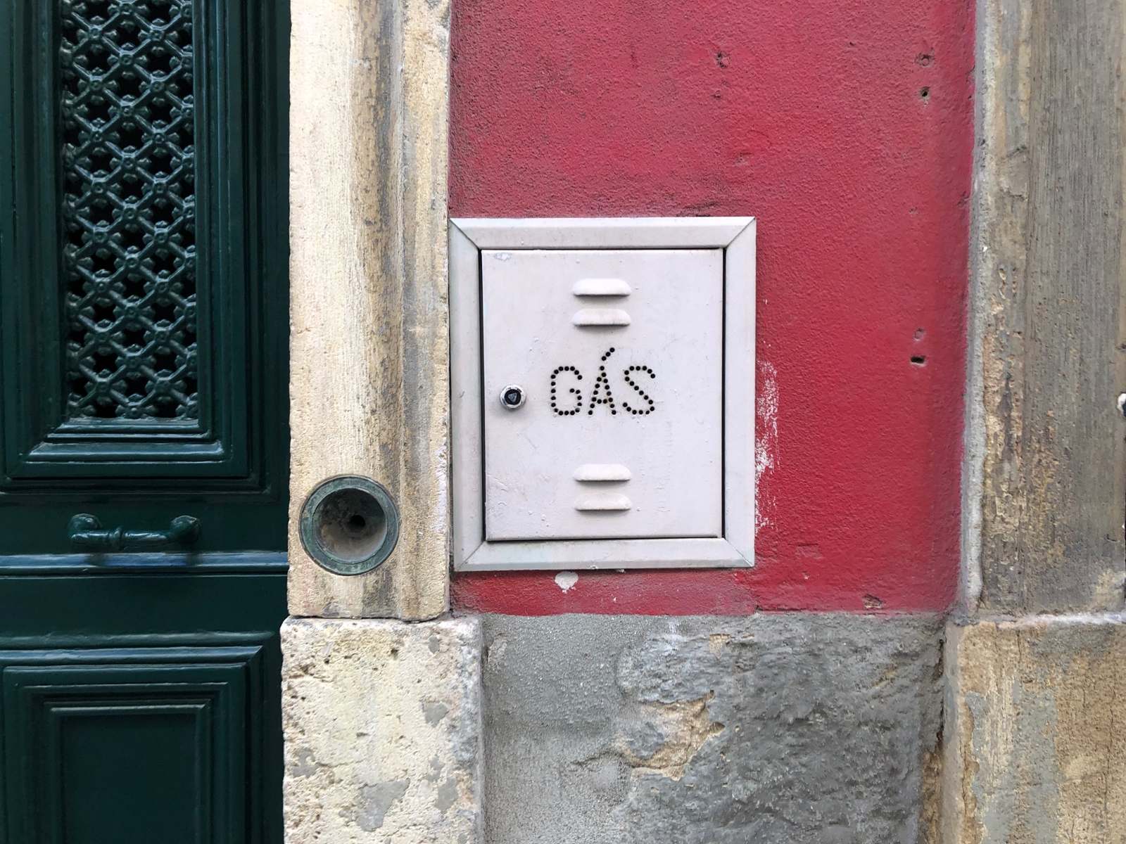 Lisbon features external access to gas with a blend of styling: traditional Portugese patterns on tile, followed by solid bright colors, then neutral tones. It was interested to find the set of doors with the punched stencil (round holes) forming the word GÁS.