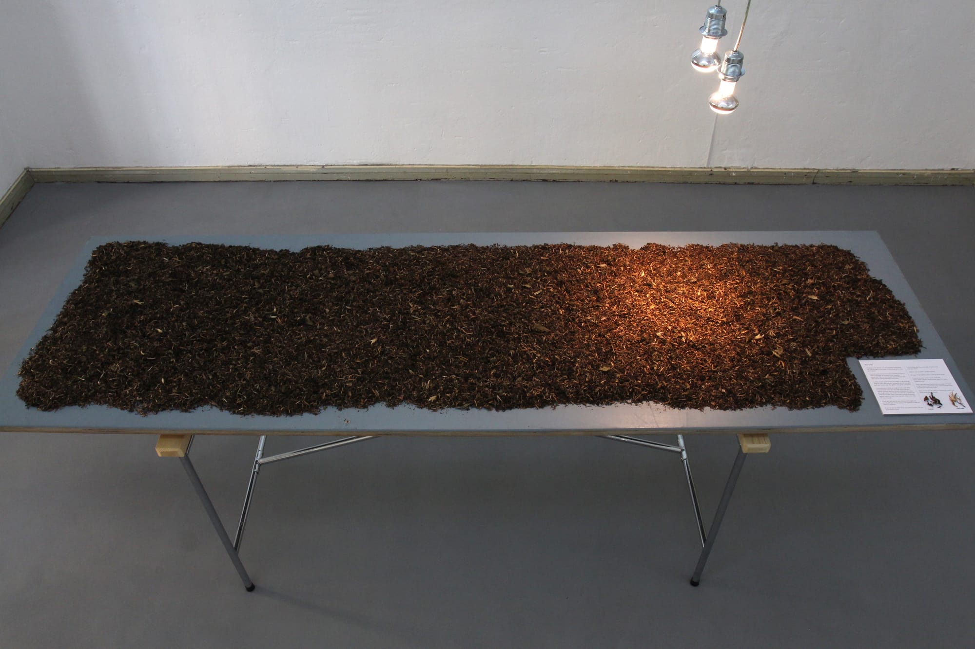 After they are pressed into paper, leaves were set aside to fully dry. I’ve been collecting these leaves since 2014. At the exhibition 4kg of used, dried tea leaves were spread out on a large conference table. Guests were encouraged to approach, touch, and even smell the tea leaves. From afar the leaves look just like simple tried leaves, but get close: you see such variety and also commonality in shape, color, texture.
