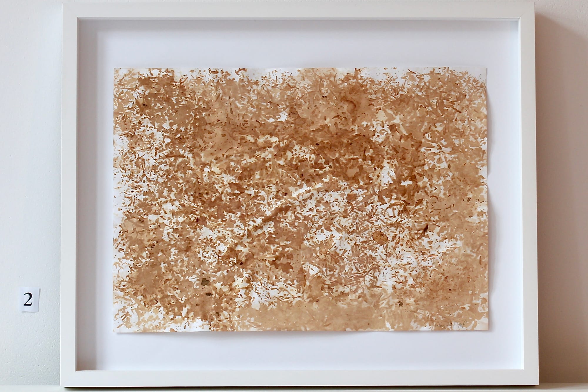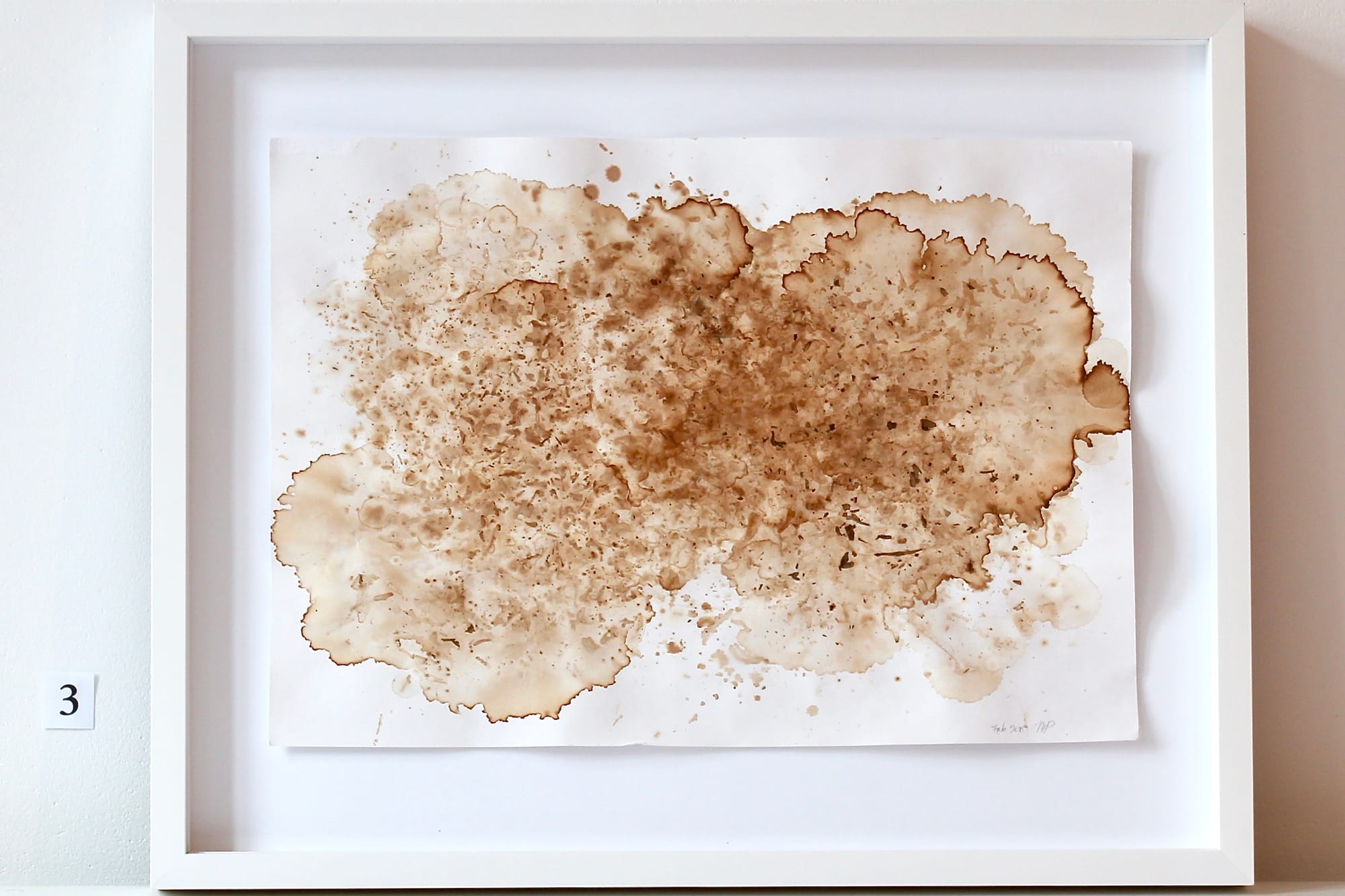 I took used (brewed) wet tea leaves spread them out in different densities onto paper. Weight was applied in some situations. The paper absorbs the tinted liquid, which then spreads. The majority of the coloroing is brown, but upon closer examination a greater range of color within brown is seen. The process also warps the paper and begins to alter the texture slightly.